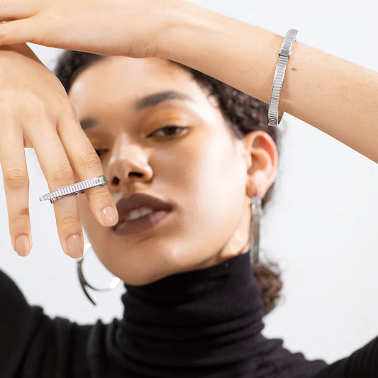 Approximately long diamond hollow titanium steel ring, female niche design, light luxury, fashionable and personalized ring